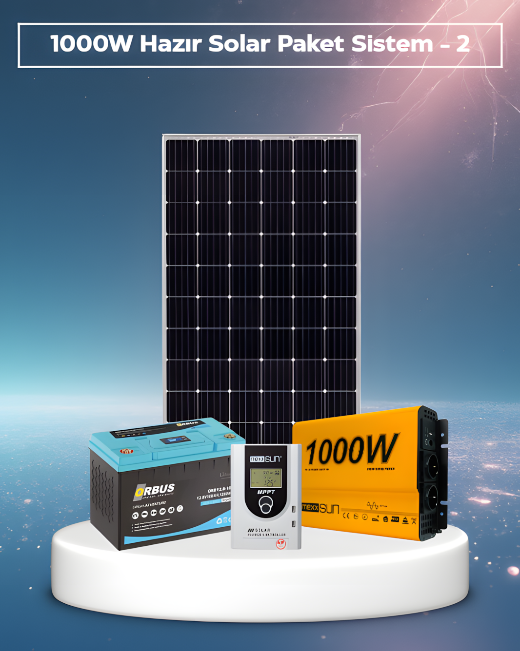 SB Solar 1000W Hazır Solar Paket, şehir şebekesinin olmadığı veya elektrik kesintilerinin yaşandığı alanlarda temel ev ve elektronik cihazları güvenle çalıştırmak üzere hazırlanmış tam sinüs off-grid güneş enerji sistemidir. LiFePO4 (Lityum) akü teknolojisi sayesinde jel akülere kıyasla daha uzun çevrim ömrü, daha hızlı şarj ve daha hafif yapı sunar.