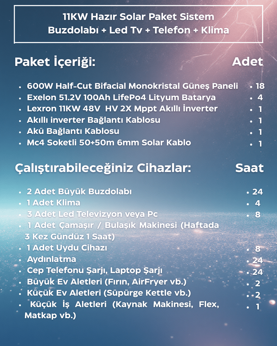 SB Solar 11KW Hazır Solar Paket; elektrik şebekesinin olmadığı veya yüksek enerji ihtiyacı bulunan alanlarda klima, buzdolabı, beyaz eşyalar, aydınlatma ve iş ekipmanlarını güvenle çalıştırmak üzere hazırlanmış yüksek kapasiteli off-grid güneş enerji sistemidir.