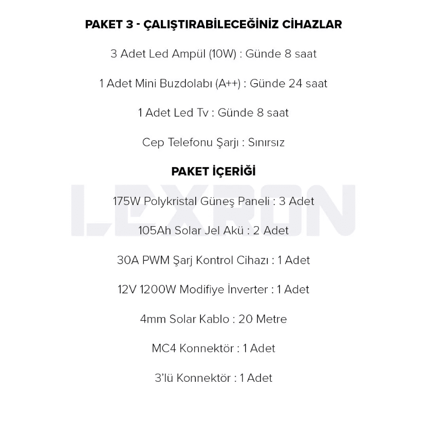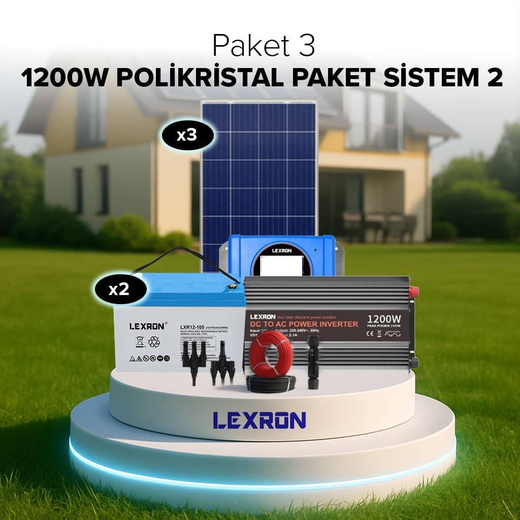 Lexron 1200W Güneş Enerjisi Sistemi, A++ sınıfı mini buzdolabı, aydınlatma ve televizyon gibi temel ev ihtiyaçlarını gün boyu karşılamak üzere tasarlanmış, giriş–orta seviye güçlü bir solar çözümdür. Panel sayısının artırılması sayesinde üretim kapasitesi yükseltilmiş, akü sistemi ile gece tüketimleri dengelenmiştir.