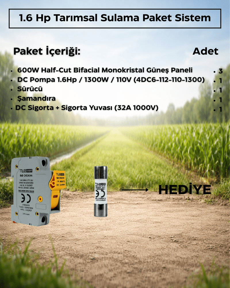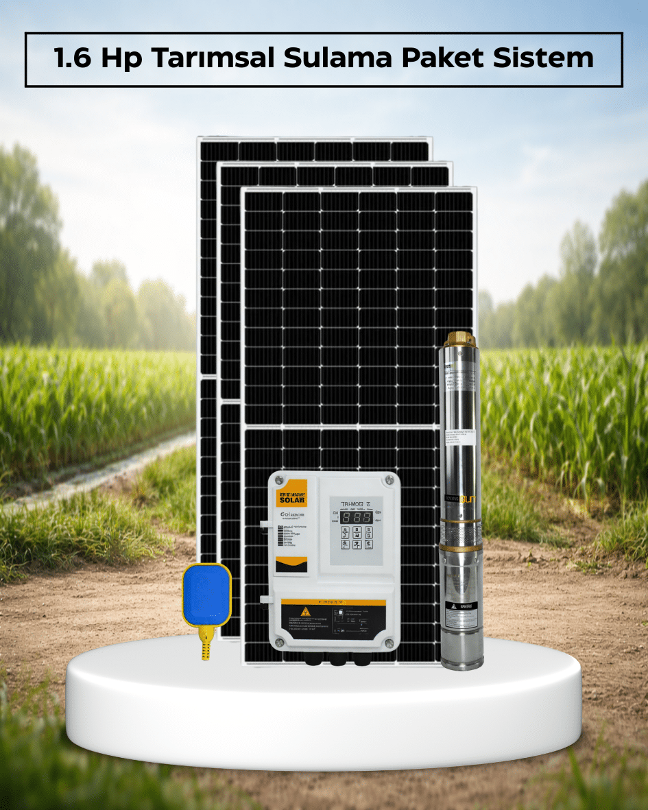1300W 1.6 HP DC Pompalı Tarımsal Sulama Solar Paket ile arazinizde elektriğe ihtiyaç duymadan güçlü, ekonomik ve sürdürülebilir sulama sistemine sahip olabilir, su ihtiyacınızı kesintisiz şekilde karşılayabilirsiniz.