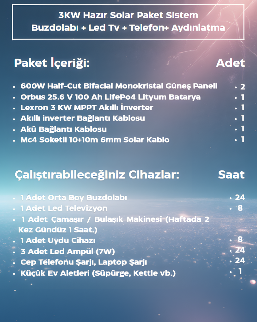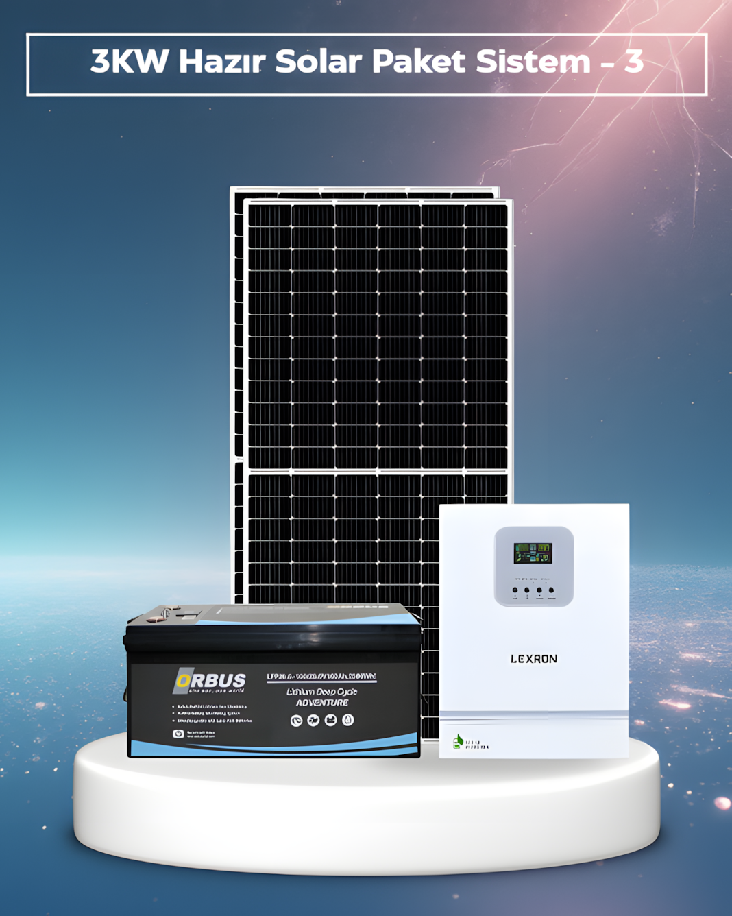 SB Solar 3KW Hazır Solar Paket | 2×600W Bifacial Panel + 25.6V 100Ah LiFePO4 Lityum Akü | MPPT Akıllı İnverter Off-Grid Sistem
