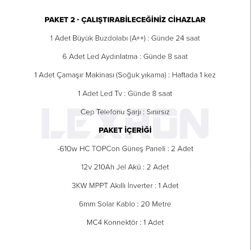 Lexron 3 kW Güneş Enerjisi Sistemi, yüksek enerji ihtiyacı olan ev ve iş yerleri için özel olarak yapılandırılmış güçlü bir solar çözümdür. Çift panel ve çift jel akü desteği sayesinde gün boyu stabil enerji sağlar; büyük buzdolabı ve çamaşır makinesi gibi cihazları güvenle çalıştırabilir.
