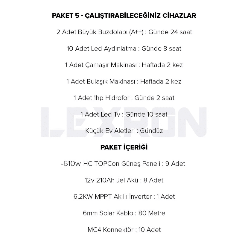 Lexron 6.2 kW Güneş Enerjisi Sistemi, yüksek panel gücü ve geniş akü kapasitesi sayesinde birden fazla buzdolabı, hidrafor ve yoğun ev aletlerinin aynı sistem üzerinden güvenle çalıştırılmasını sağlar. Büyük aileler, çiftlik evleri ve küçük işletmeler için uzun süreli ve dengeli enerji çözümü sunar.