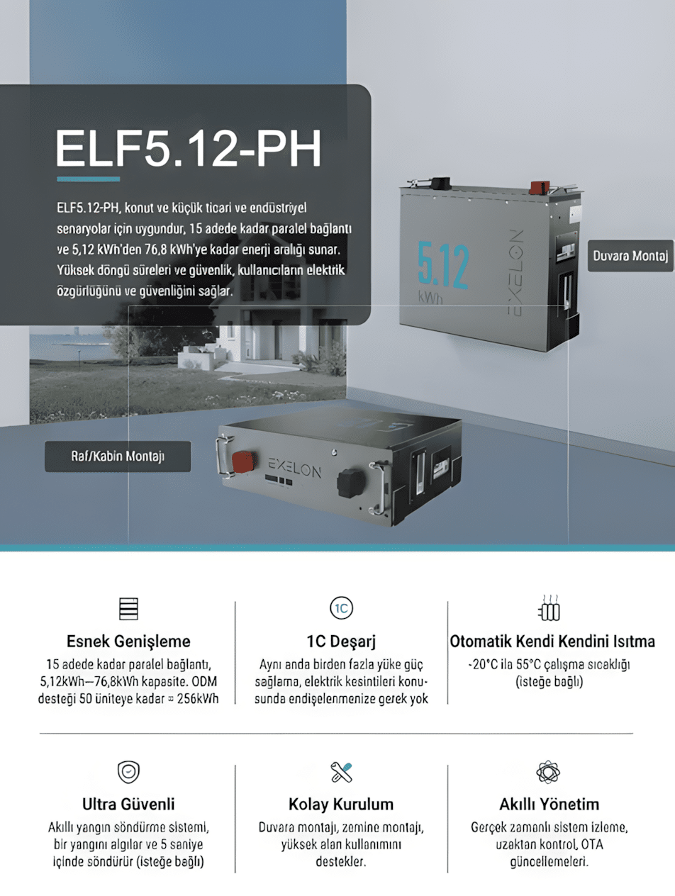 Exelon ELF5.12-PH 51.2V 100Ah lityum akü; konut, küçük ticari ve endüstriyel uygulamalar için geliştirilmiş, yüksek güvenlikli ve uzun ömürlü bir LiFePO4 enerji depolama bataryasıdır. 5.12 kWh nominal enerji kapasitesi ile hem off-grid hem hibrit güneş enerjisi sistemlerinde yüksek verimlilik sağlar.