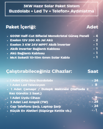 3kw Hazır Solar Paket – 2 | 4×600W Bifacial Panel + 2×200AH Jel Akü | Mppt Akıllı Inverter Off-Grid Sistem